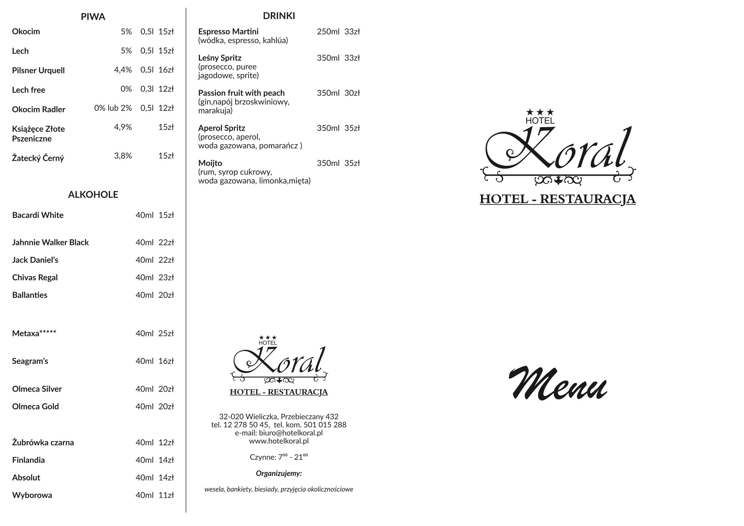 Zapraszamy do restauracji Hotelu Koral*** w Wieliczce – wyjątkowego miejsca, gdzie szacunek do kulinarnej tradycji spotyka się z nowoczesnym podejściem do smaku, a każdy posiłek staje się przyjemnością dla zmysłów.