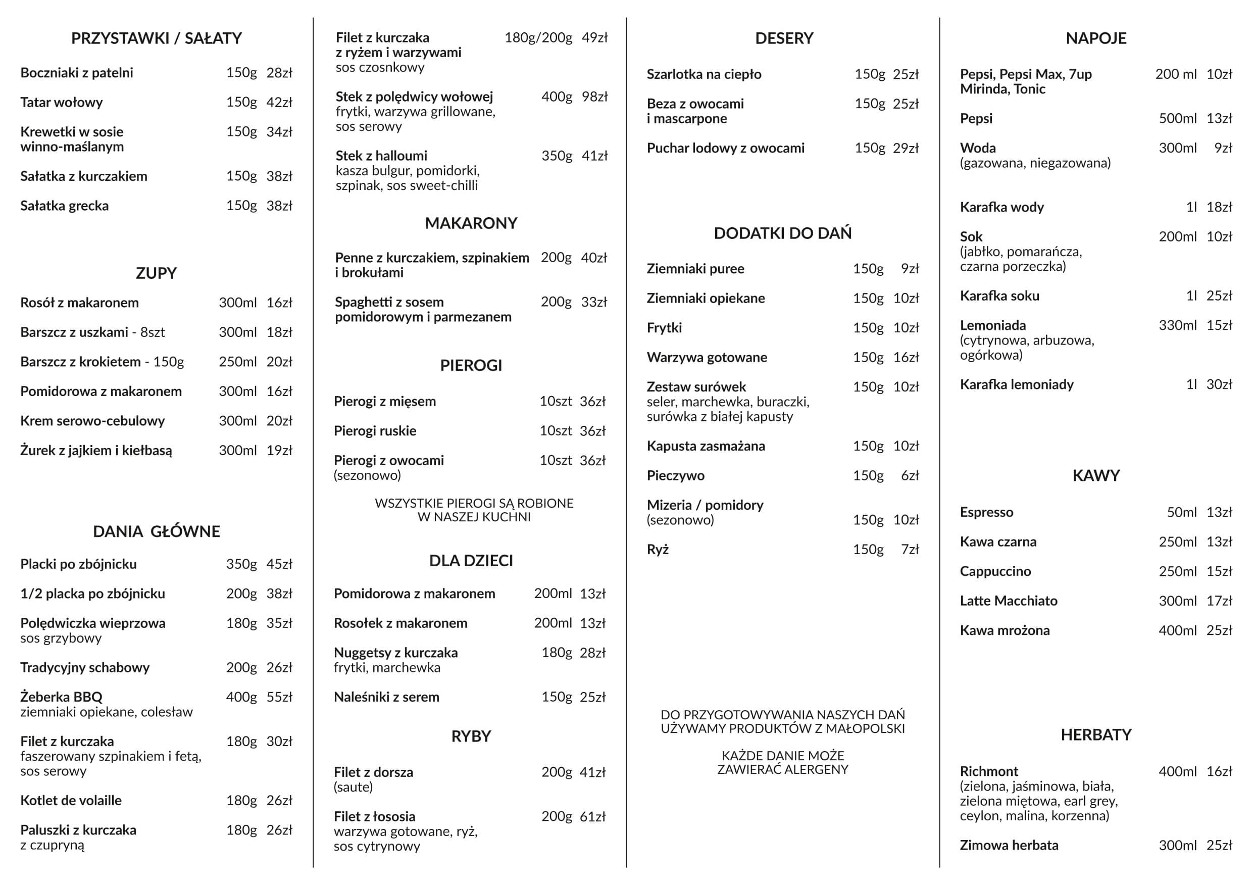 Nasza kuchnia to połączenie klasycznych dań kuchni polskiej z inspiracjami międzynarodowymi. Wszystkie potrawy powstają na bazie świeżych, lokalnych produktów z Małopolski, a ich przygotowaniem zajmuje się doświadczony Szef Kuchni. Dzięki temu mamy pewność, że każdy posiłek dostarczy wyjątkowych wrażeń kulinarnych – niezależnie od tego, czy odwiedzasz nas na niedzielny obiad z rodziną, lunch biznesowy czy romantyczną kolację.